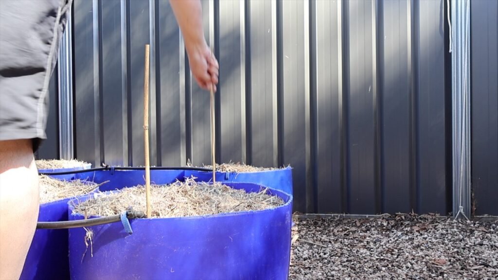 I cut them down and placed one on each side of the drums, then ran some leftover irrigation line between them to form arches across the row. Repeating that across all six drums gave the net something to sit on so it stayed lifted above the plants rather than sagging down into them.