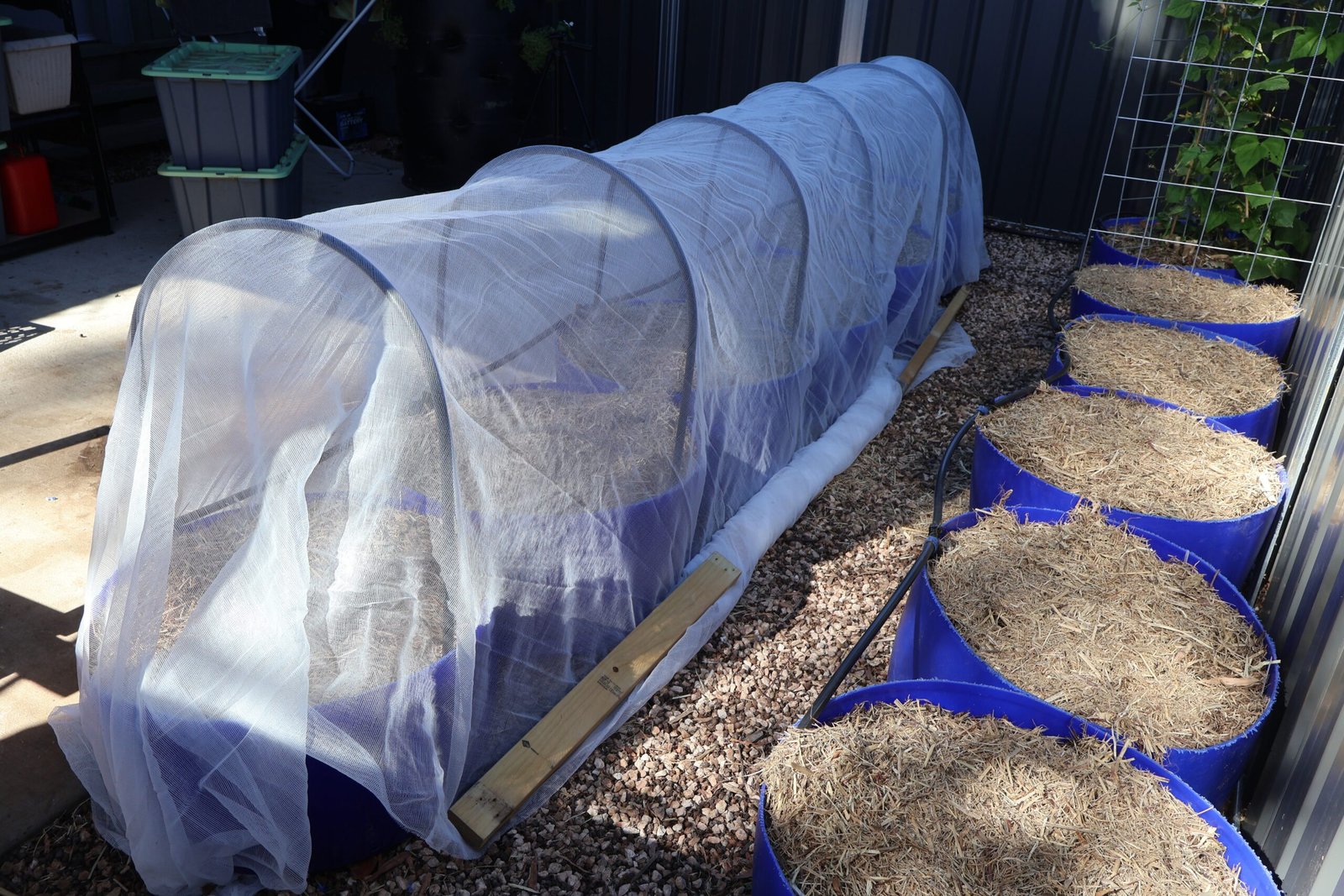 I did try clipping the net directly to the drums, but it pulled the net too close to the plants. As they grew, they would have ended up pressing against it, which defeats the point a bit. The timber worked better because it helped hold the sides down without pulling everything inward too tightly.