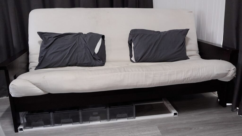 The first change was getting some cheap drawers to go under the futon.