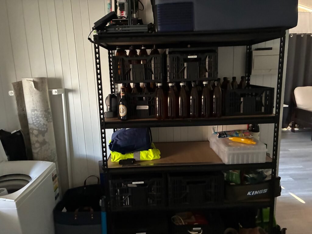 The washing machine area, camping gear, work gear, home brew equipment, freezer, brewing fridge, tools, first aid kit, and all the extra odds and ends still need to live somewhere. That side of the house isn’t as neat as the main room, but even there I try to keep things grouped into tubs and categories so it stays usable.
